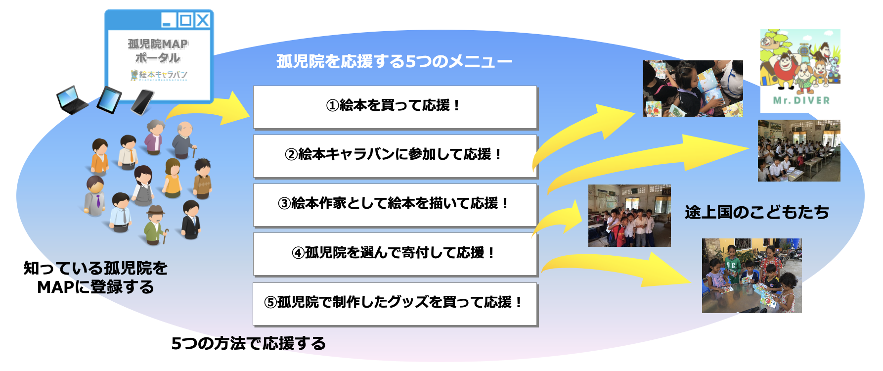 絵本キャラバンで世界の孤児院を訪問していて、毎回思うことがあります。それが「孤児院を訪問してせっかくのご縁を作れたのだから、他にも何か継続して支援することが出来ないだろうか?」です。本プロジェクトが目指すのは、訪問した孤児院のこどもたちの成長を応援したいあなたの力を結集し「孤児院MAP」を作成、「5つの応援方法」を提供することで、継続的な支援が実現できる共創型プラットフォームの構築です。「孤児院MAPポータル」が完成すれば、それまで地図上に載っていなかった孤児院をマッピングすると共に、そこに住むこどもたちが孤児院に至るまでのストーリーを、世界の支援者へ伝えていくことが可能となります。