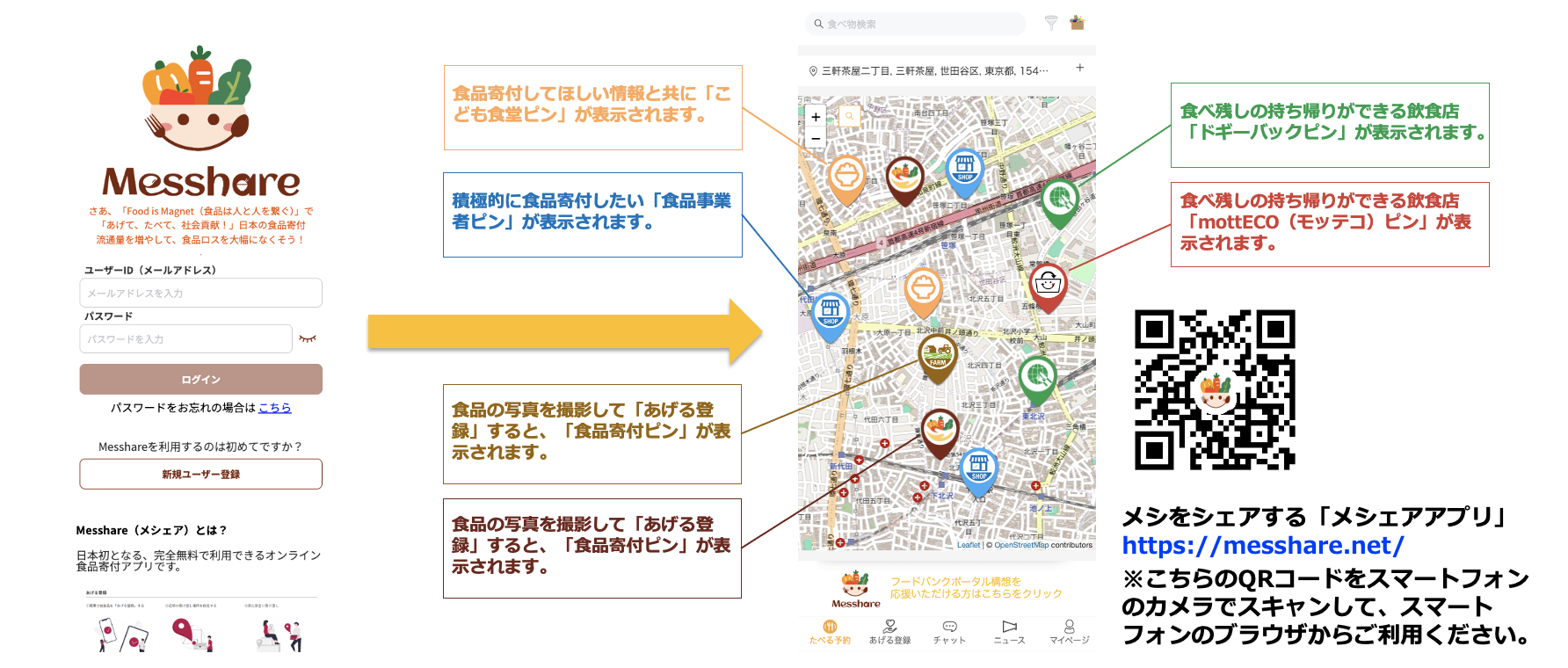 「Messhare(メシェア)」とは、ご近所同士で食品を「あげたい人」「たべたい人」をオンラインでマッチング、「Food is Magnet(食品は人と人を繋ぐ)」「あげて、たべて、社会貢献!」「おいしく、わけあう」のキャッチコピーで日本の食品寄付流通量を増やすことで食品ロスを大幅に削減することを目指し、食品ロス問題という社会問題の解決のみならず、大きなソーシャルインパクトを巻き起こす狙いで開発した「フードバンクポータルアプリ」です。
