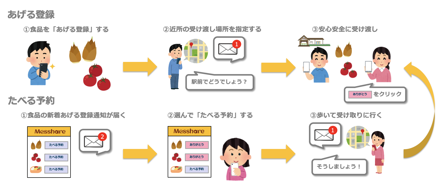 一般家庭は廃棄寸前食品、飲食店は廃棄寸前食品や試食品を「あげる登録」、たべることで社会貢献できるご近所さんは「たべる予約」、駅・公園・お店などの安心安全な公共の場所で取引は成立です。